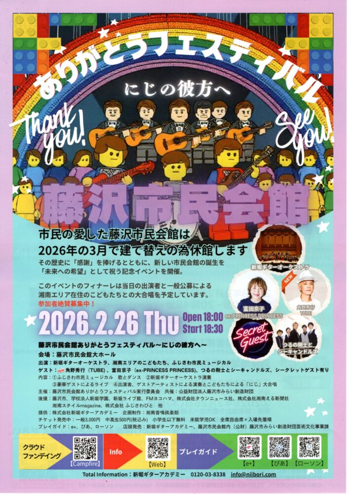 1968年10月に開館した藤沢市民会館は、さまざまな文化芸術の発表やイベントの会場として50年以上親しまれてきましたが、建物や設備の老朽化、バリアフリー対応への困難さなどの理由で、2026年3月末で閉館、建て替えることが決まってます。その歴史に「感謝」し、新しい市民会館誕生を祝う「藤沢市民会館ありがとうフェスティバル〜にじの彼方へ〜」が、2月26日(木)藤沢市民会館大ホールにて開催されます。