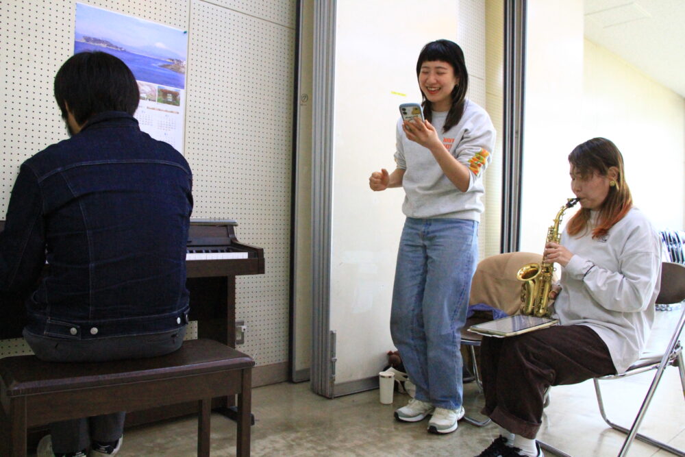 現在、プロとして活動している2人、ボーカル専攻で、最近はウクレレの弾き語りも行うという夕夏さんは、斬新なアイデア出しが得意の楽団の広報担当。サックス専攻でジャズバンドで演奏している友希さんはデザイン担当、チラシのイラストやHPのデザインも手がけているそう。この日は友希さんのバンドメンバーの方に練習用のピアノ伴奏をお願いしたそうです。
