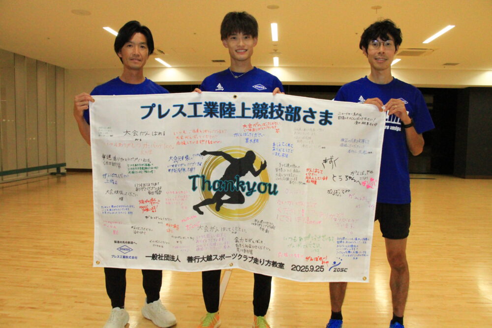 帰り際に、予選会突破を目指すプレス工業陸上競技部を応援する旗にメッセージを寄せ書き。子ども向けかけっこ教室の参加者も書き込み、立派な応援旗になりました。