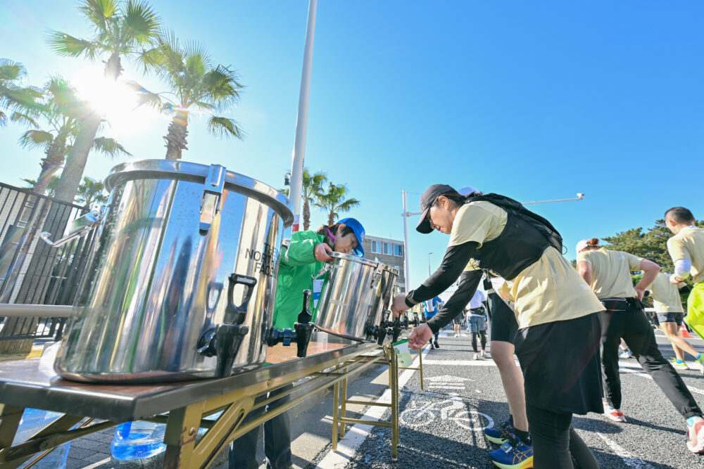 ランナーはマイボトル、マイカップ携行で、給水ポイントにて給水(写真/湘南国際マラソン事務局)