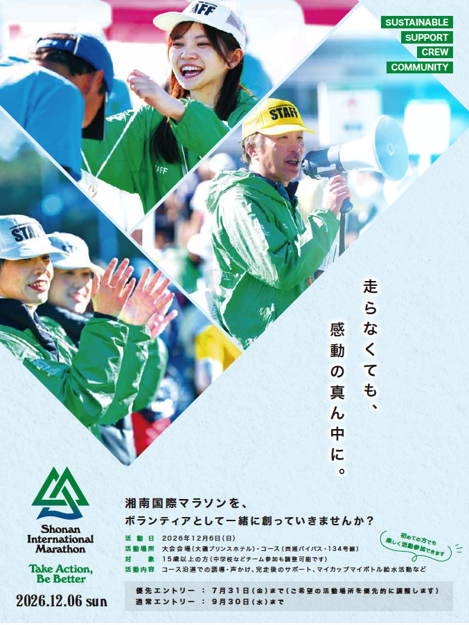 マラソンのコースは藤沢市内も通過するため、沿道で応援したり観戦した方もいることでしょう。行き交う大勢のランナーを目にし、ちょっと参加してみたい気持ちも。「でもマラソンを走るのはちょっと・・・」と思っている人も、大会を支えるボランティアとして参加が可、こちらも4月4日(土)から募集が始まっています。